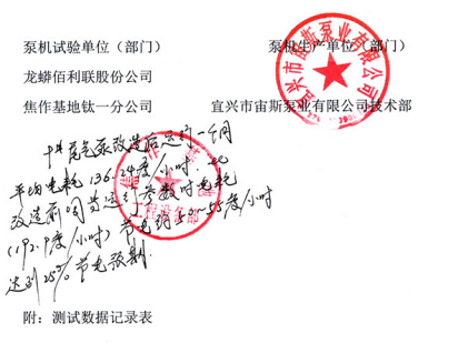 一、評價意見:該泵在龍蟒佰利聯基地的尾氣脫硫崗位上,經2018年10月起連續運行試驗表明,改良后的該型防腐離心泵與未改良前比較,在提高了流量、揚程的條件下,在工藝條件沒有變化的情況下,有明顯的節電節能效果,能節能25%左右(詳見測試記錄表)。