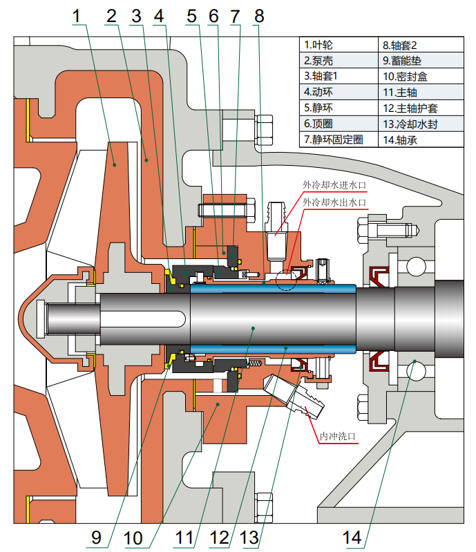 此類密封有帶沖洗水和不帶冷卻水兩種,圖示為不帶冷卻水密封結構,在確認介質不可能抽空并且密封部位不易產生堵塞的工況適用,因省略了外冷卻水的接入,簡化了管路的安裝,同時確?,F場的整潔,與雙端面密封對比成本更低,這種密封的泵輸送流量不可大于500m³/h。