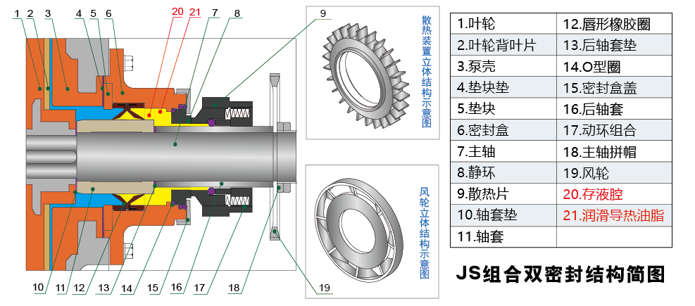 動力密封在前擋砂,起到密封砂漿的作用,機械密封在后密封存液腔(20)中的存液(清液或油脂),存液腔中的存液起到潤滑機封的動靜環(huán)和軸套與唇形橡膠密封圈的作用。與此同時,又起到傳遞熱能的作用,即密封部位的熱量傳導到密封外側的散熱裝置(9)上。散熱裝置包括散熱片,風輪的功能是在泵機運轉時把密封部位的熱量散布出去,保證軸密封安全運行。