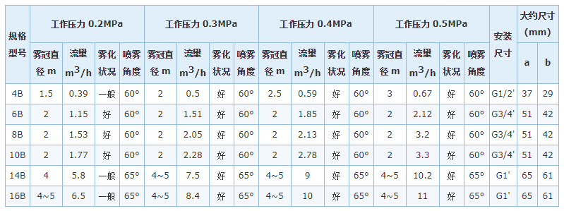 B型噴嘴產(chǎn)生實(shí)心錐形噴霧形狀,噴流角度為60°。這種噴嘴可在絕大多數(shù)管道系統(tǒng)上安裝或更新。在0.3MPa壓強(qiáng)下,流率從0.5至8.4m3/h。